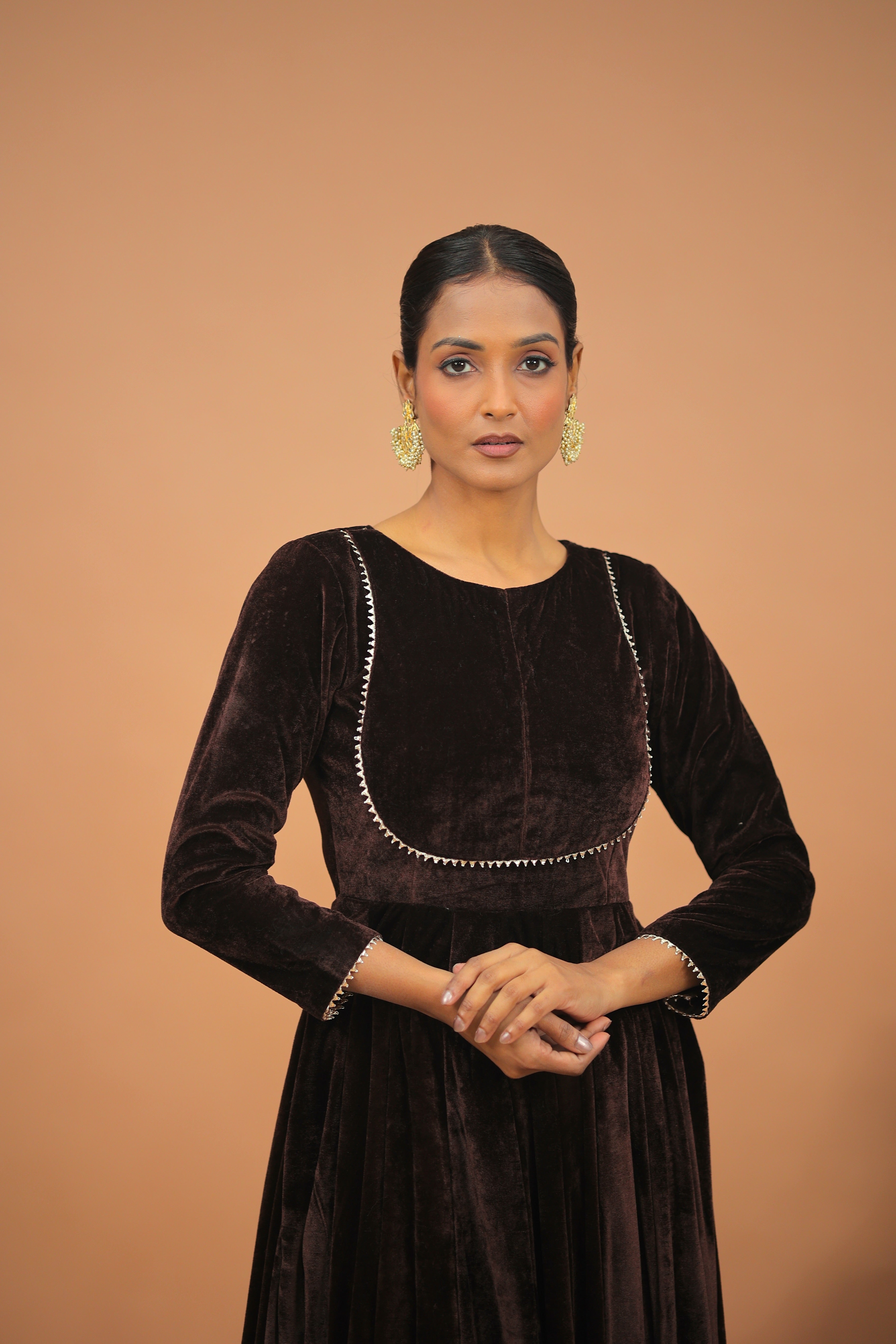 Crafted in sumptuous velvet, this ensemble exudes timeless elegance and winter charm. The flowing Anarkali silhouette is elevated with delicate detailing along the neckline and borders, creating a refined balance of richness and grace. Paired with matching bottoms and a softly draped dupatta, this piece is perfect for festive evenings, intimate celebrations, and elegant soirées.