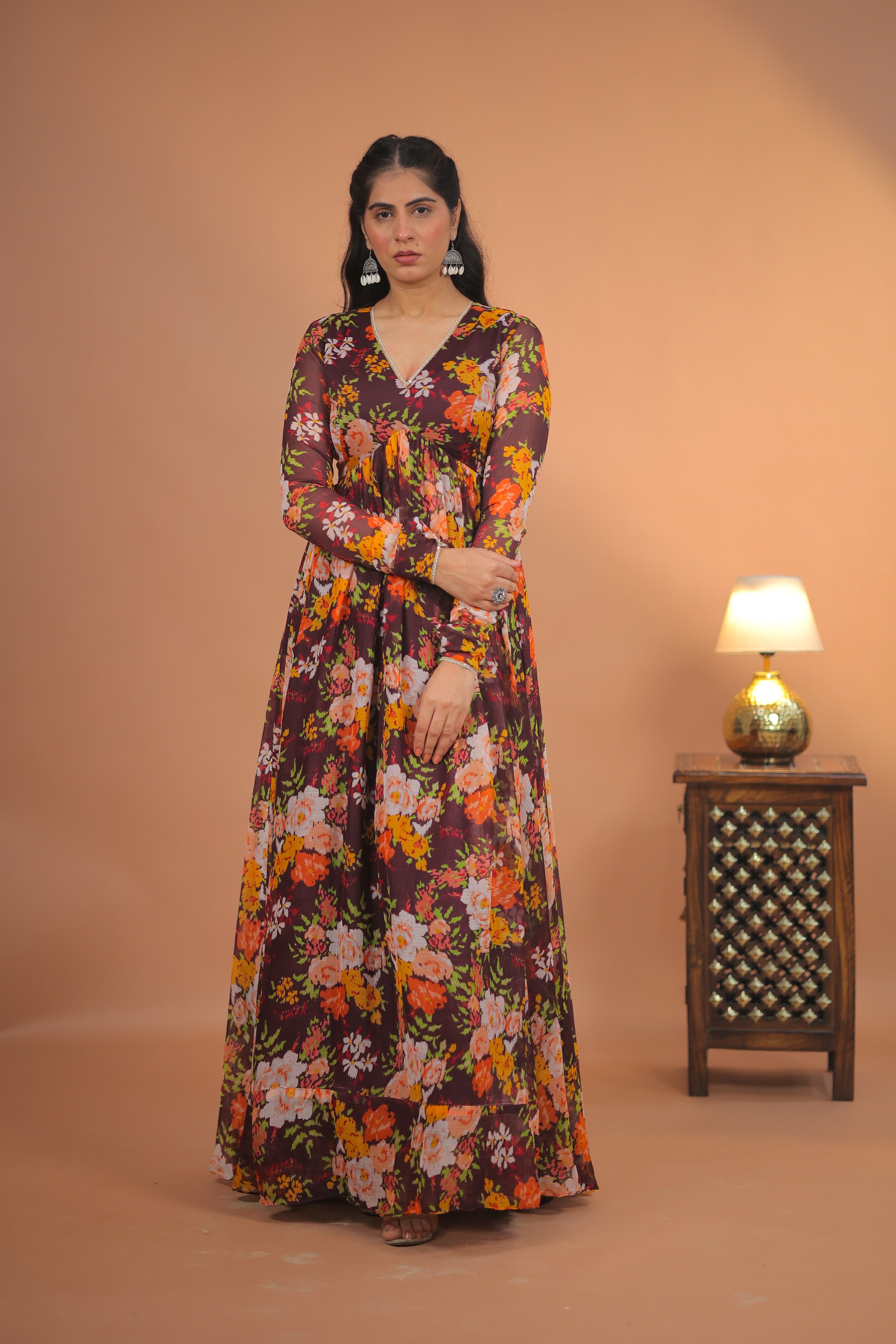 A rich floral anarkali in warm earthy tones with a graceful flow.