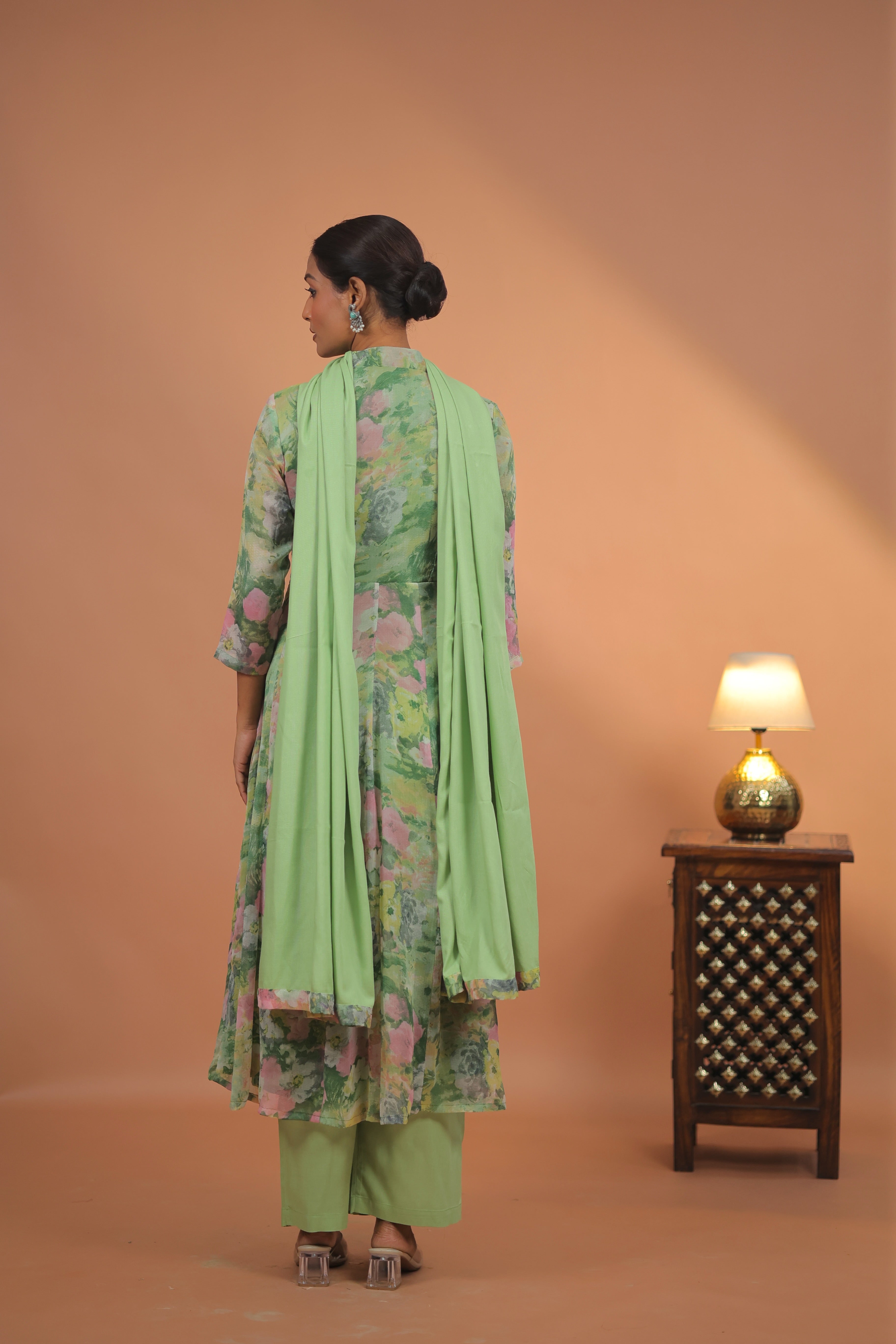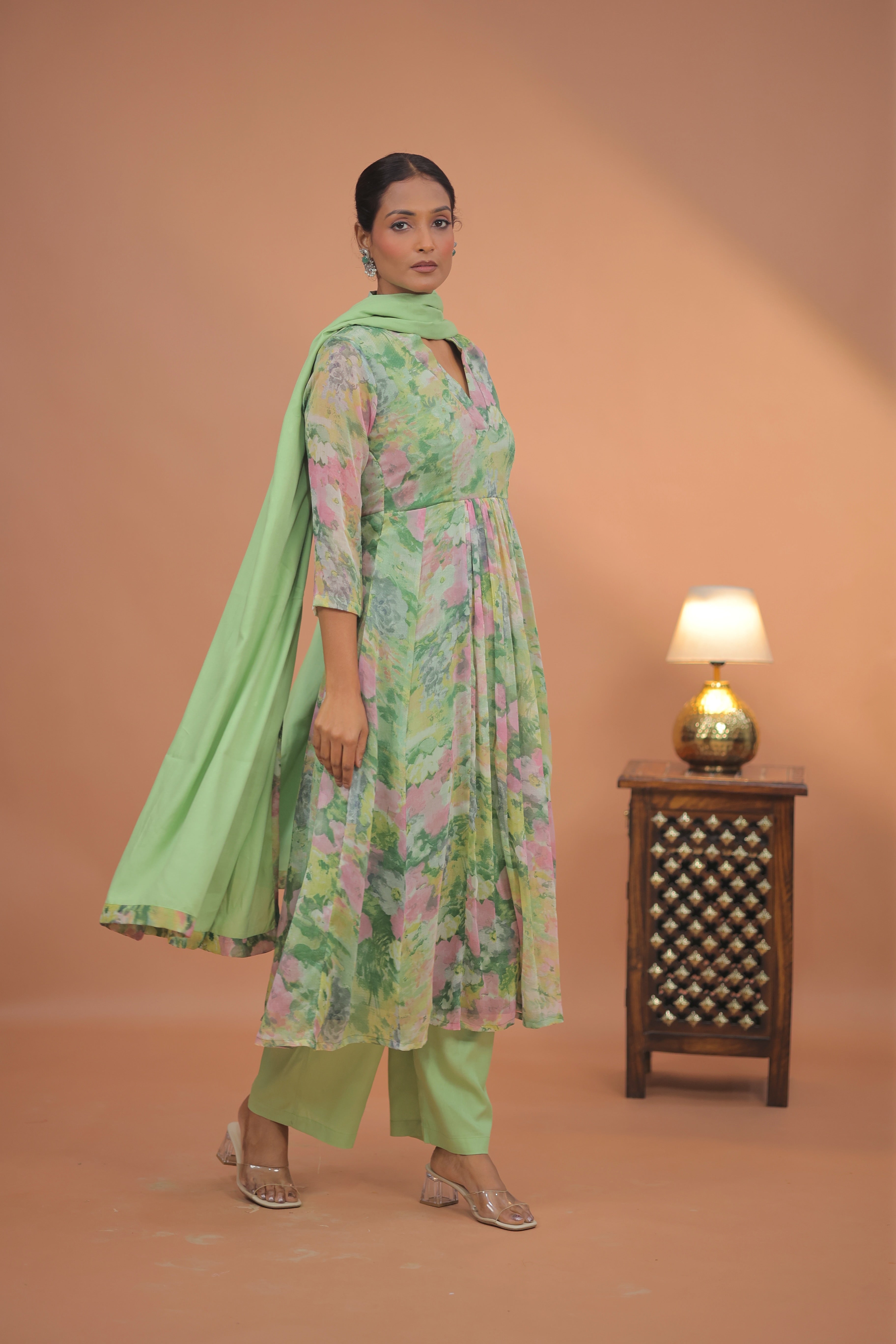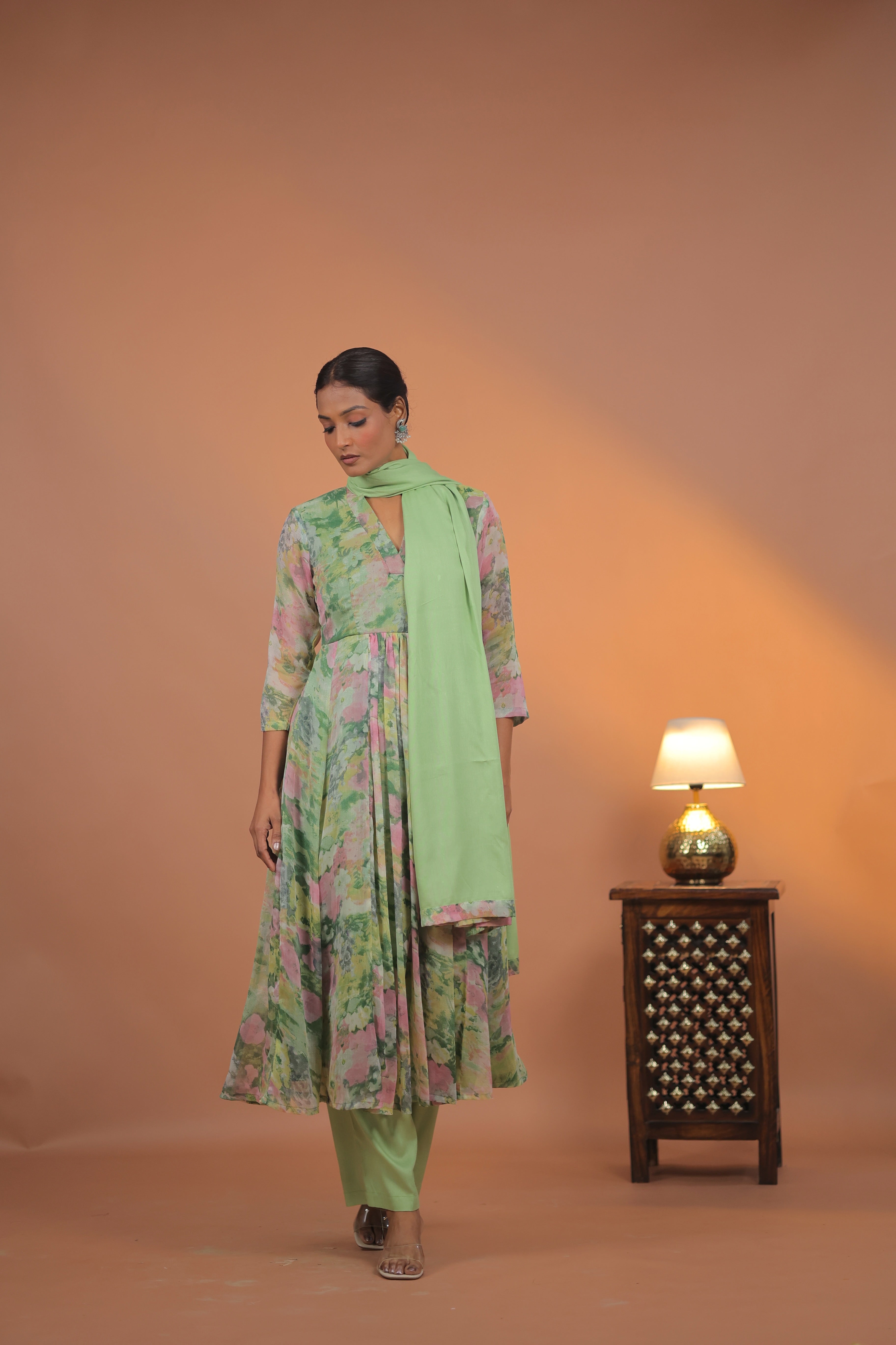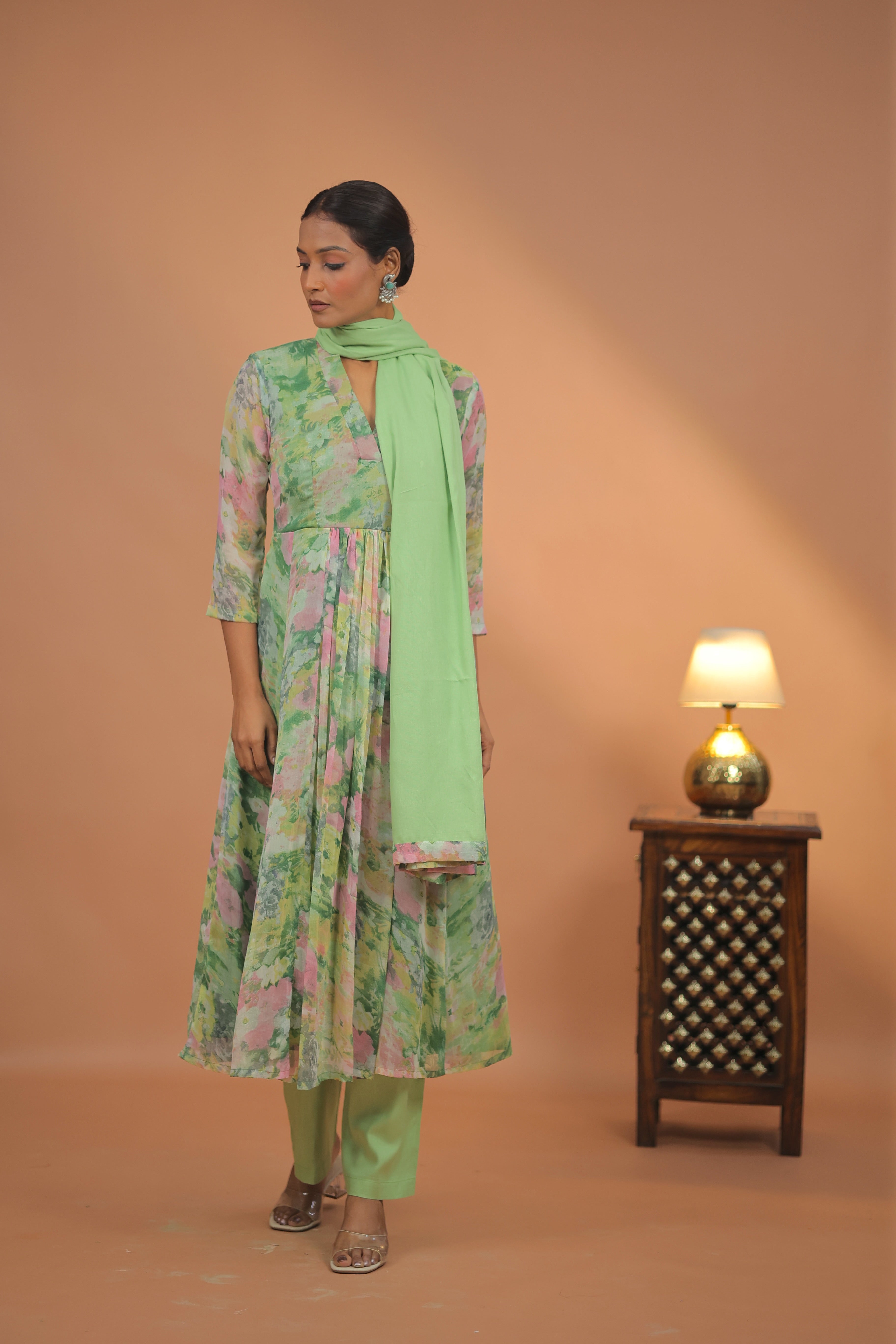 Soft pastel florals on a refreshing mint base with an easy, flowing drape.